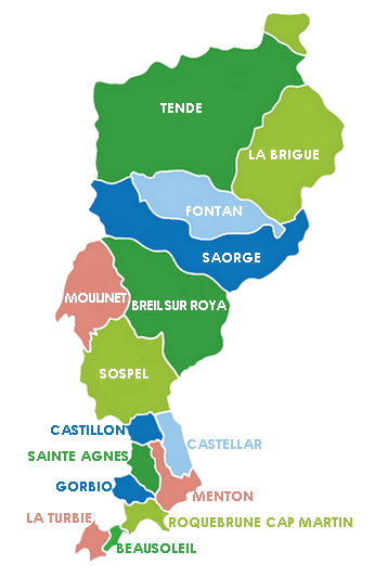 Menton, Beausoleil, Roquebrune-Cap-Martin, Cap d’Ail, Sospel, La Turbie, Tende, Breil-sur-Roya, Gorbio, Sainte-Agnès, Castellar, La Brigue, Saorge, Castillon, Fontan et Moulinet.